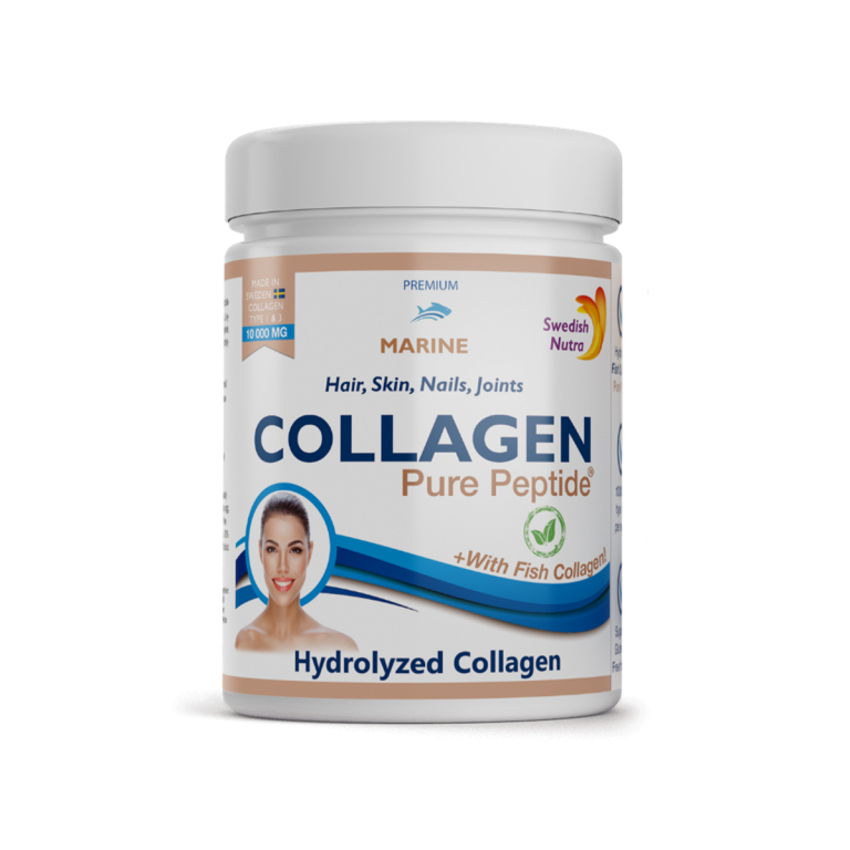 Swedish Nutra Marines Kollagenpulver liefert eine hochreine Dosis von 10.000 mg hydrolysiertem Fischkollagen pro Portion, unterstützt eine gesunde Hautelastizität, kräftiges Haar und Nägel, Gelenkkomfort und die allgemeine Vitalität.