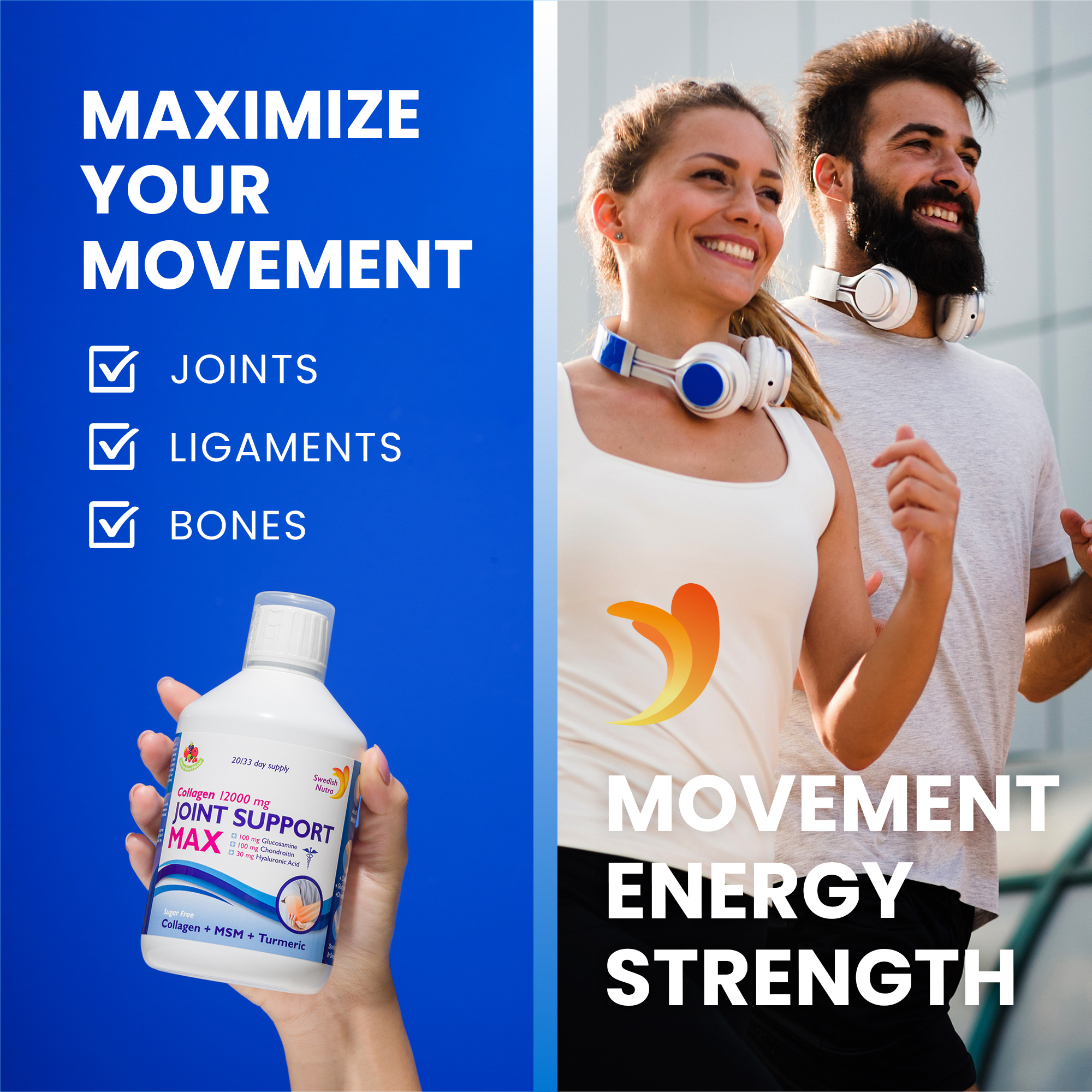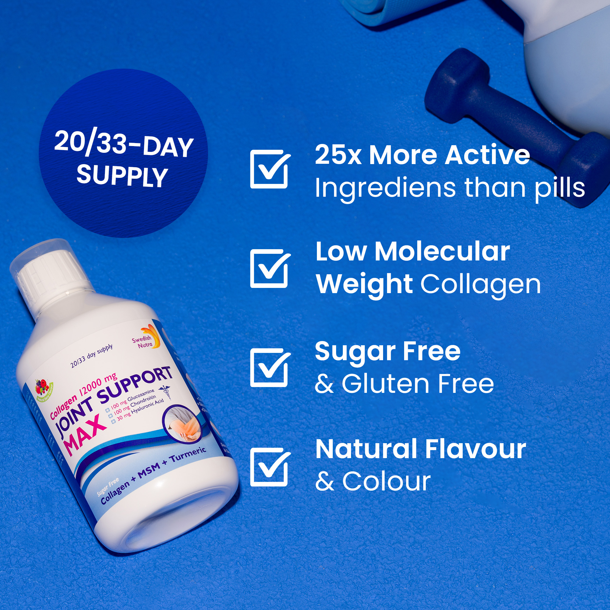 Joint Support Max es un suplemento líquido de alta concentración con 12 000 mg de colágeno hidrolizado por dosis diaria.
