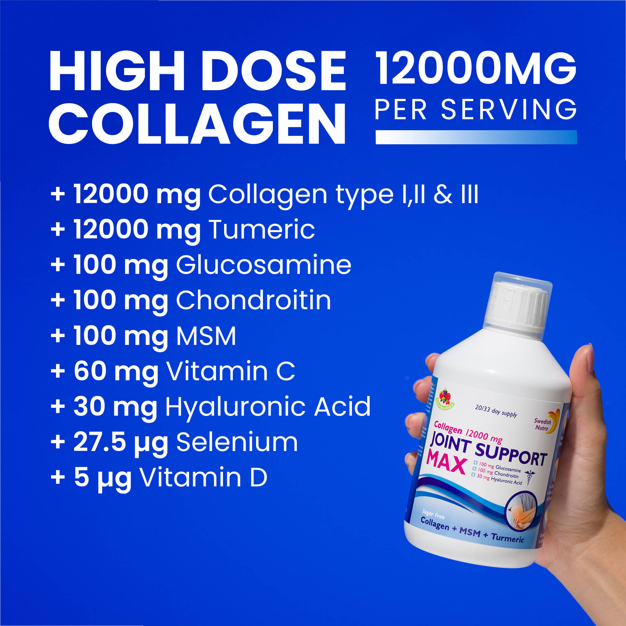 Elaborado en Suecia, combina 3 tipos de colágeno con potentes ingredientes funcionales como ácido hialurónico, glucosamina, condroitina, MSM, zumo de cúrcuma, vitamina C, D3 y selenio.