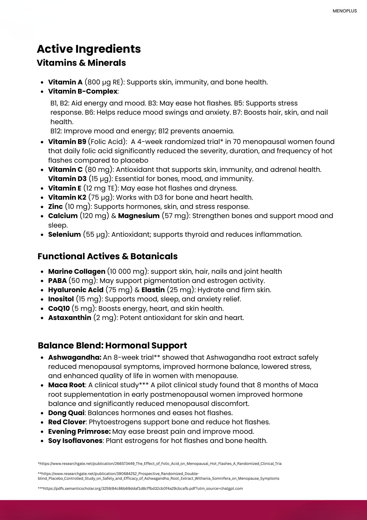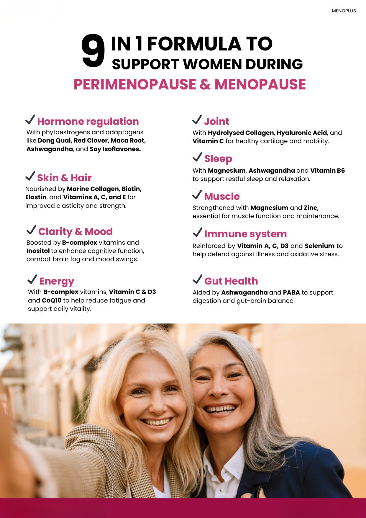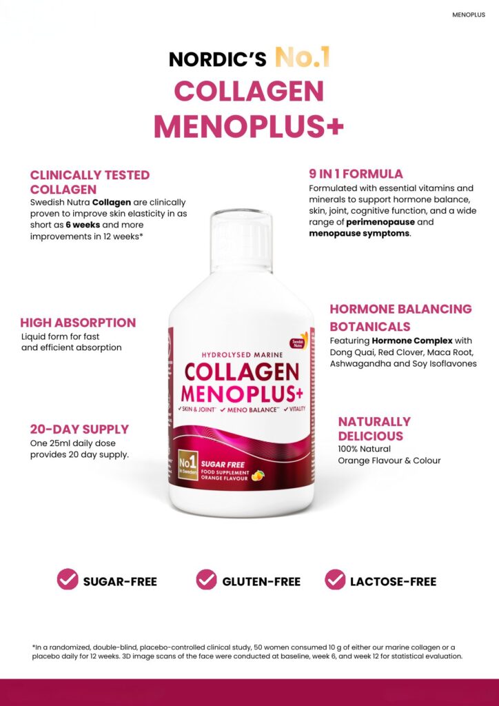 Swedish Nutra Collagen Menoplus+ is an advanced liquid formula designed to support women through every stage of perimenopause and menopause. It combines 10,000 mg hydrolyzed marine collagen with 31 active ingredients, including vitamins, minerals, adaptogens, phytoestrogens and antioxidants — all working together to promote hormone balance, skin health, energy, mood and sleep quality.