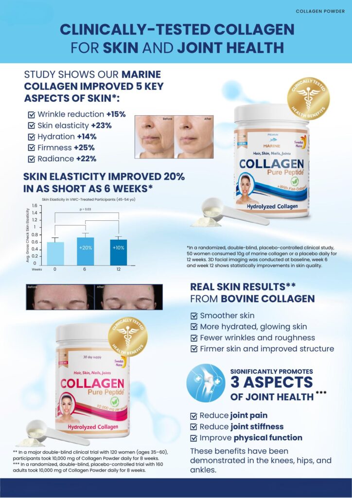 Swedish Nutra Marine Collagen Powder provides a high-purity dose of 10,000 mg hydrolysed fish collagen per serving, supporting healthy skin elasticity, strong hair and nails, joint comfort, and overall vitality.