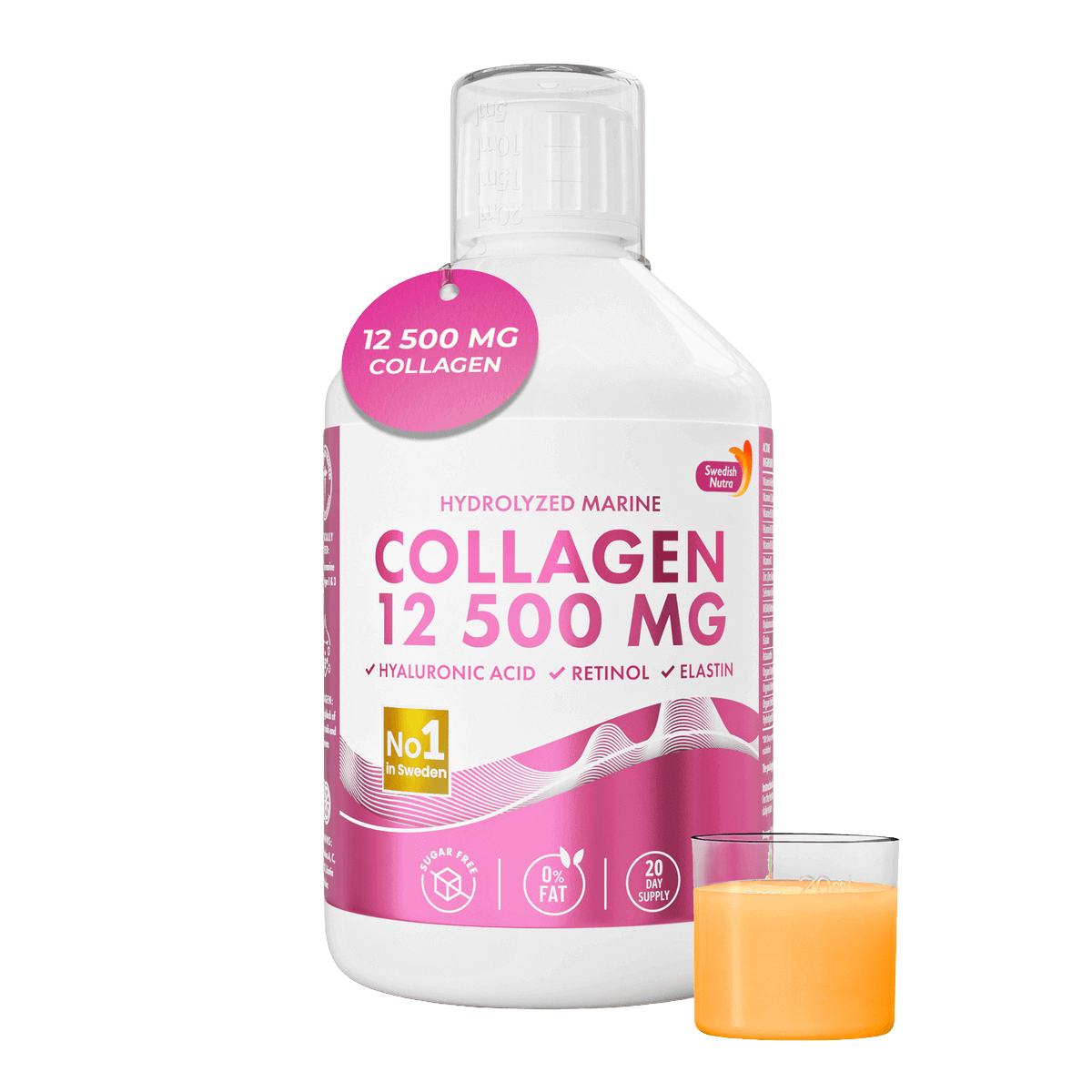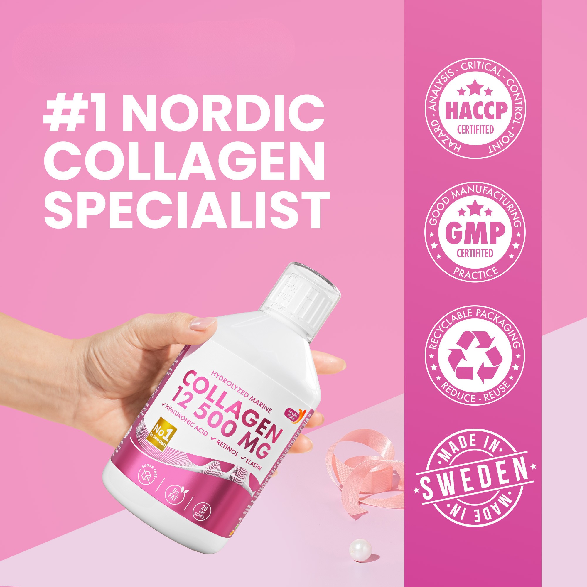 Nordic Collagen 12 500 mg is a high-quality liquid supplement formulated to support youthful skin, strong hair and nails, and flexible joints.