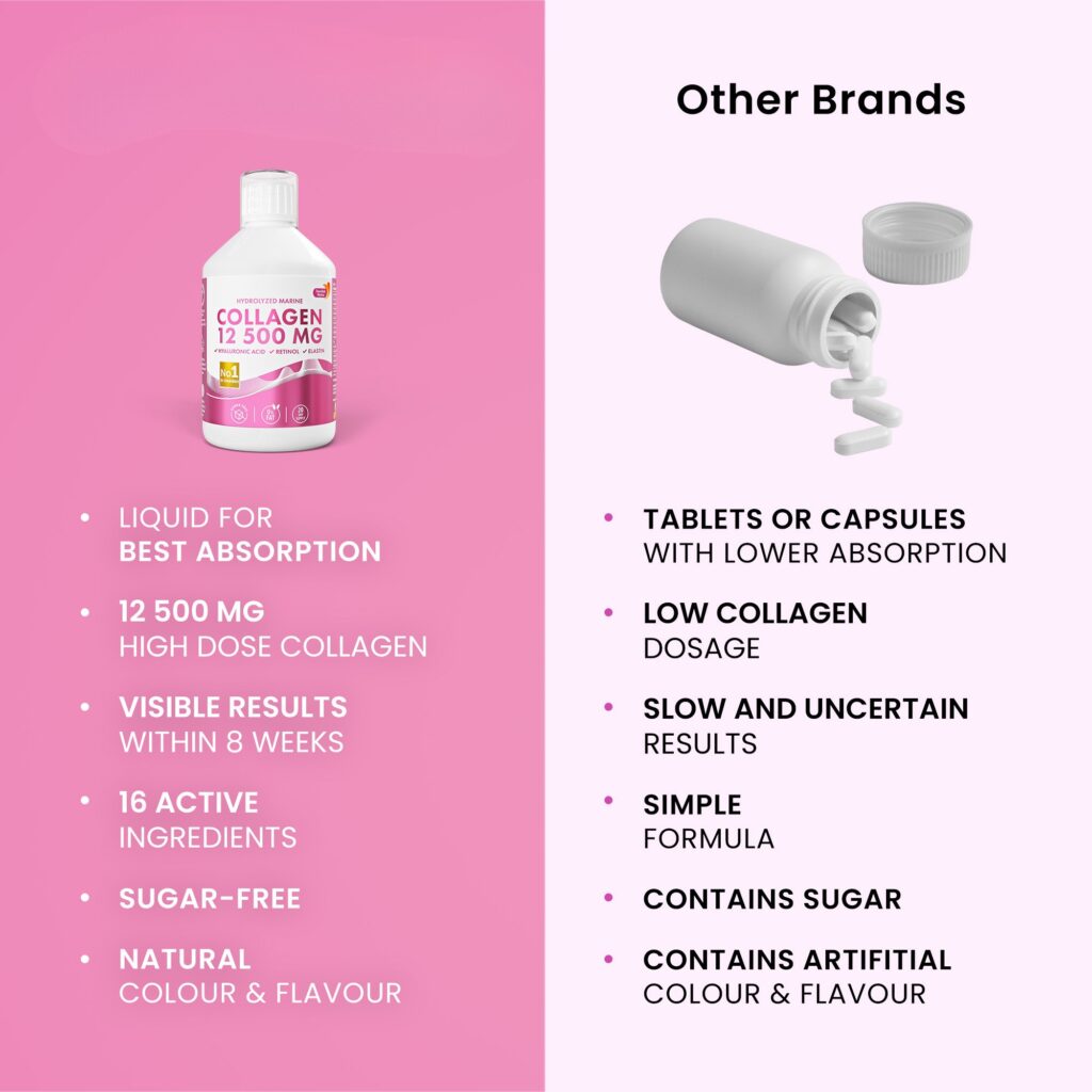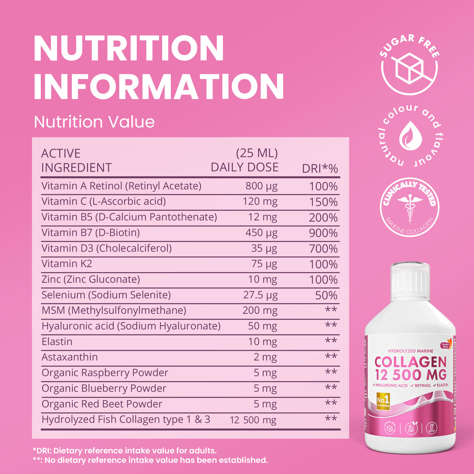It delivers 12 500 mg of hydrolyzed marine collagen types I & III, combined with essential vitamins, minerals, and antioxidants for visible and lasting results.