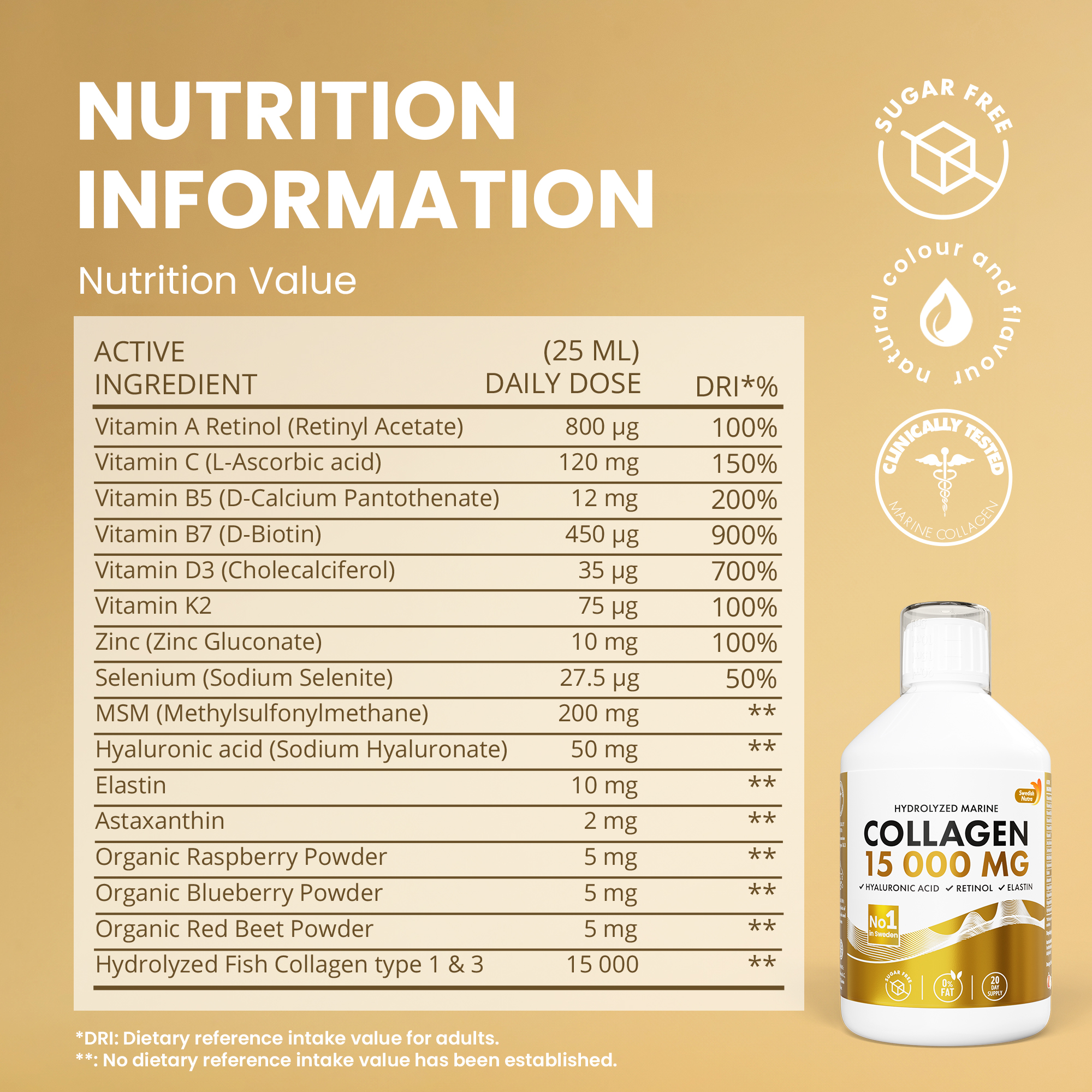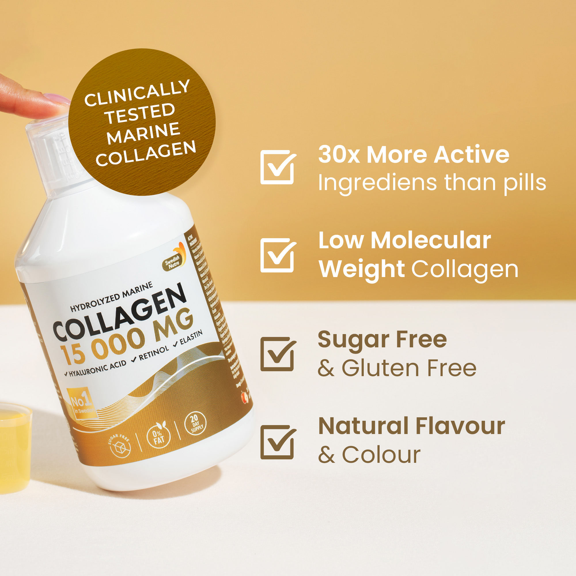 It delivers 15 000 mg of hydrolyzed marine collagen types I & III, combined with essential vitamins, minerals, and antioxidants for visible and lasting results.